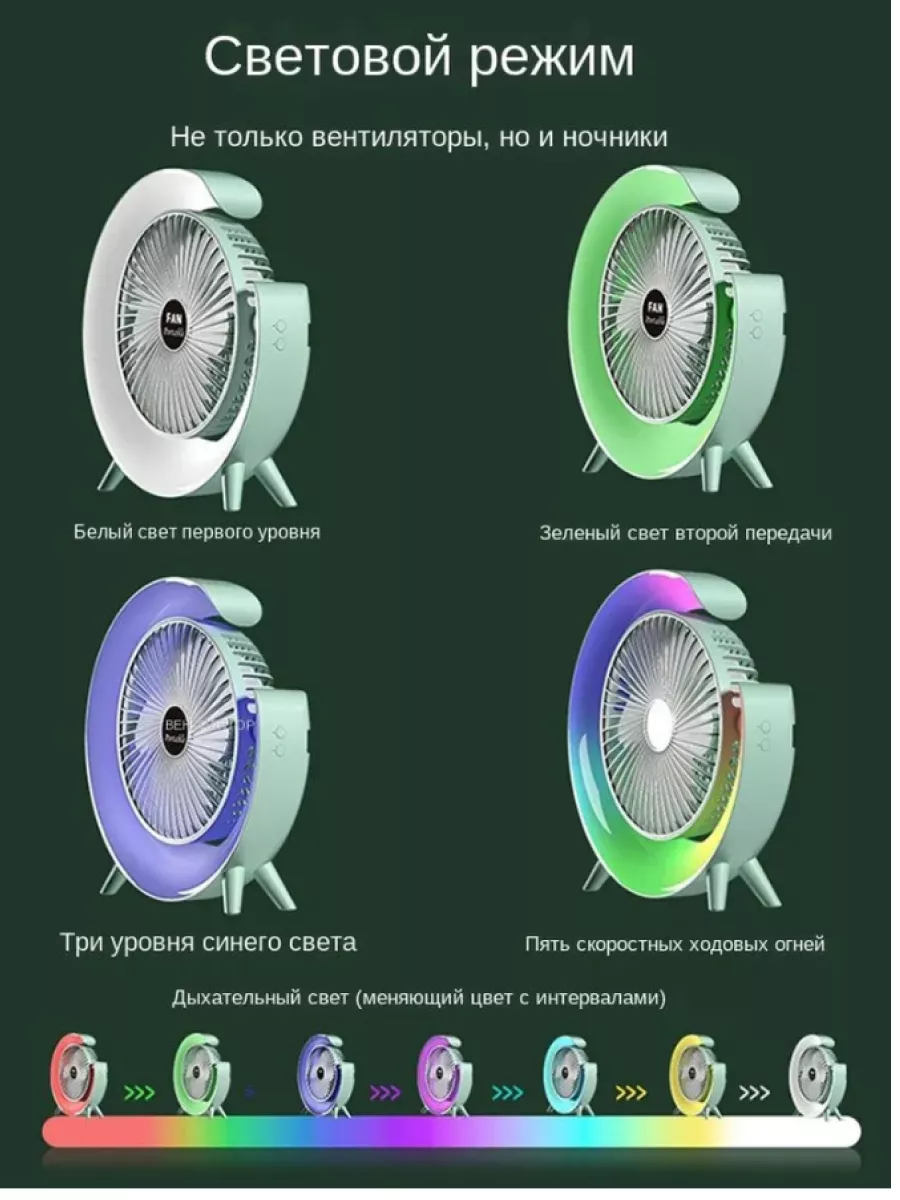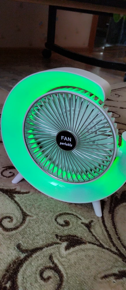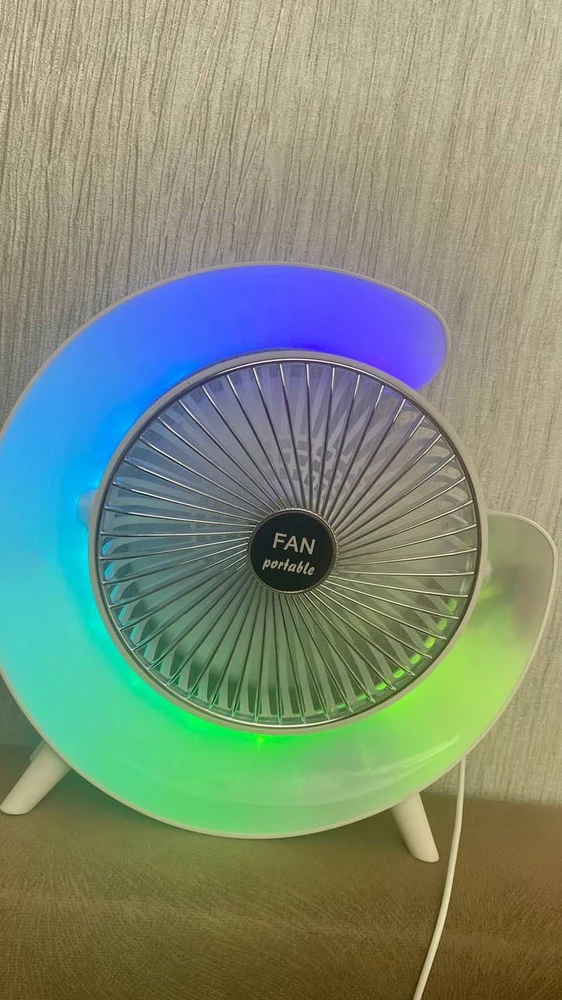 Идеальный вентилятор для лета! Очень понравилось, что он не только охлаждает, но и служит как ночник. Световые режимы просто класс — особенно "дышащий" и разноцветный. Работает тихо, не мешает спать. Компактный, легко переставляю с рабочего стола на прикроватную тумбочку. Реально спасение в жару!